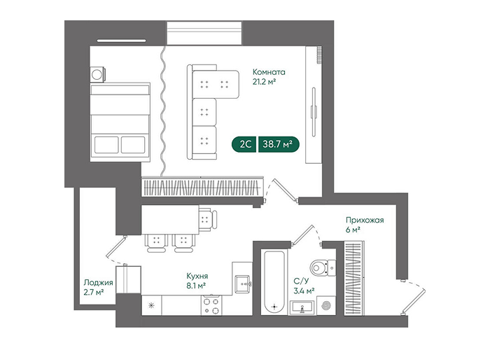 2К студия 38,7 кв.м